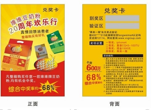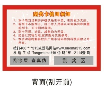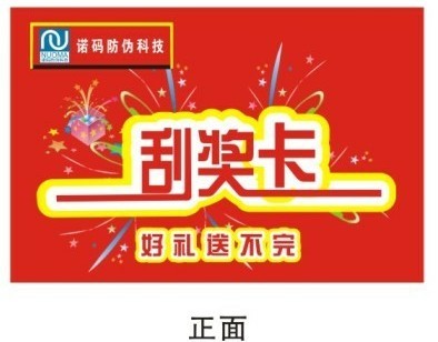 促銷防偽卡是商家促銷時免費贈給消費者的一種能刮開或者揭開的一種卡片,也叫做刮獎卡,刮刮卡。促銷防偽卡的設(shè)計一般分為正面、背面、獎項級別以及防偽技術(shù)等幾個部分。是商家在搞促銷活動、擴大銷售時慣用的一種手段。