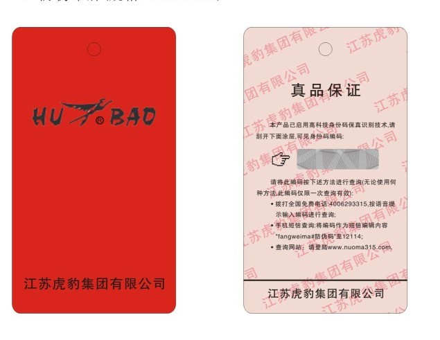 針對(duì)服裝、鞋、帽、眼鏡等吊牌適用的商品,將數(shù)碼與吊牌防偽結(jié)合為一體,幫助企業(yè)有效的打擊假冒偽劣商品和解決頭疼的竄貨難題。產(chǎn)品根據(jù)